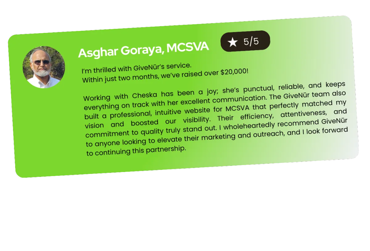 The GiveNūr team also built a professional, intuitive website for MCSVA that perfectly matched my vision and boosted our visibility.